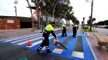 Los pasos de peatones junto al Nuevo Colombino, de azul y blanco