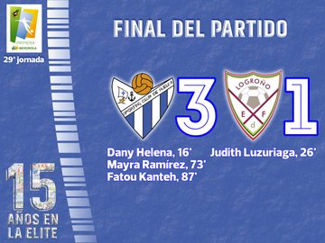 El Sporting Huelva, Ciudad que Marca ha conseguido hoy una victoria por 3-1 que se antoja casi definitiva para lograr la permanencia, ya que se ha impuesto al colista, al que elimina de su lucha por la salvación y aumenta a los 11 puntos su colchón sobre la zona de descenso. EL partido comenzó bajo una intensa lluvia con una falta que lanzó Cinta Rodríguez directamente a las manos de Pamela Tajonar (1'). Siguió un minuto más tarde un cambio de orientación de Mayra Ramírez a Fatou Kanteh, que no pudo controlar en el área. En el minuto 8 Julie Tavlo envió a córner el balón tras una internada de Dany Helena. Ni la brasileña ni Mayra Ramírez lograron rematar el balón tras el saque de esquina. Solo un minuto más tarde volvió a la carga el Sporting con un disparo desde la frontal del área de Vanesa Santana que se fue fuera, ligeramente desviado. El dominio era casi total onubense pero dio un susto en el minuto 10 en el conjunto riojano tras un balón en profundidad de Ana Velázquez a Judith Luzuriaga, que disparó alto. Un par de minutos después un ase desde la derecha de Mayra Ramírez no lo aprovechó Fatou Kanteh, que perdió la pelota en el área. Siguió un cabezazo de Dany Helena que detiene Pamela Tajonar (13'). Ese remate de la brasileña fue un aviso que se concretaría tres minutos después, con un testarazo al fondo de la red tras un saque de esquina de Yoko Tanaka.