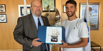 Sotomayor hizo entrega de una carabela al futbolista onubense, que aún no tiene cerrado su nuevo destino, en un acto privado